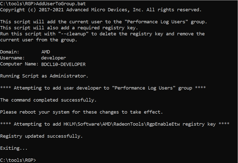A batch file is provided to perform the above two actions (scripts\AddUserToGroup.bat). The batch file should be run as administrator (Right click on file and select “Run as Administrator”). The script’s output is shown below: