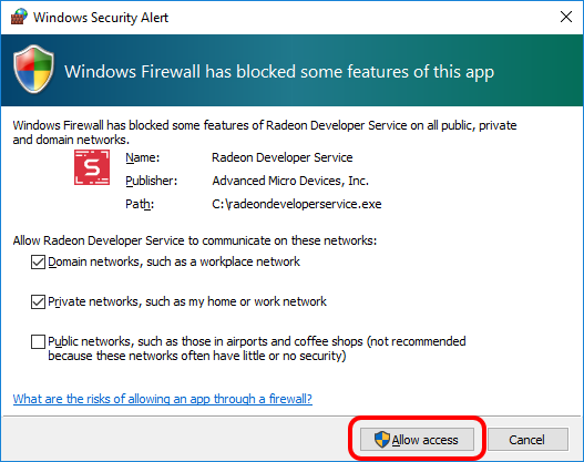 The Windows firewall alert in no way indicates that the Radeon Developer tools are trying to communicate to an AMD server over the internet. The Radeon Developer tools do not attempt to connect to a remote AMD server of any description and do not send personal or system information over remote connections. The Radeon Developer Panel needs to communicate with the Radeon Developer Service, which may or may not be on the same machine, and a connection needs to be made between the two (normally via a socket).
