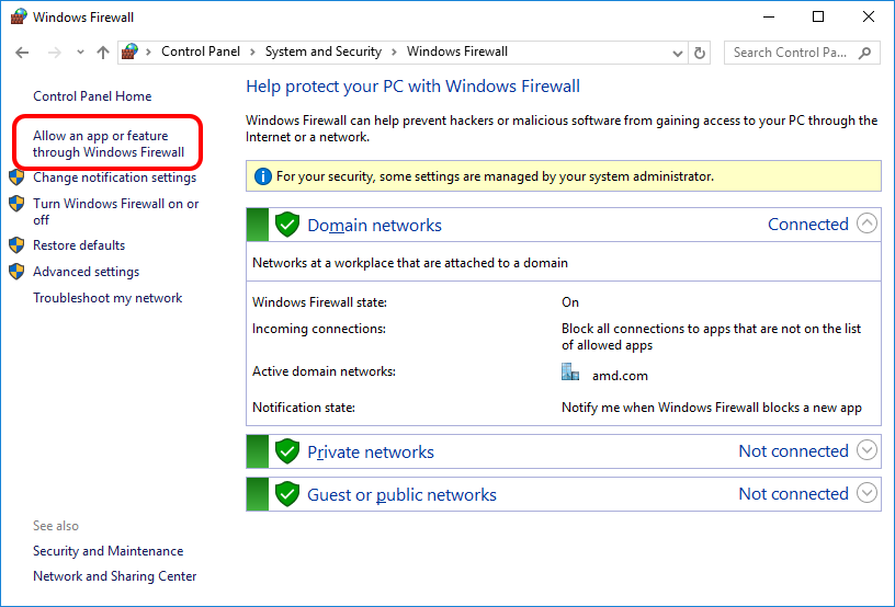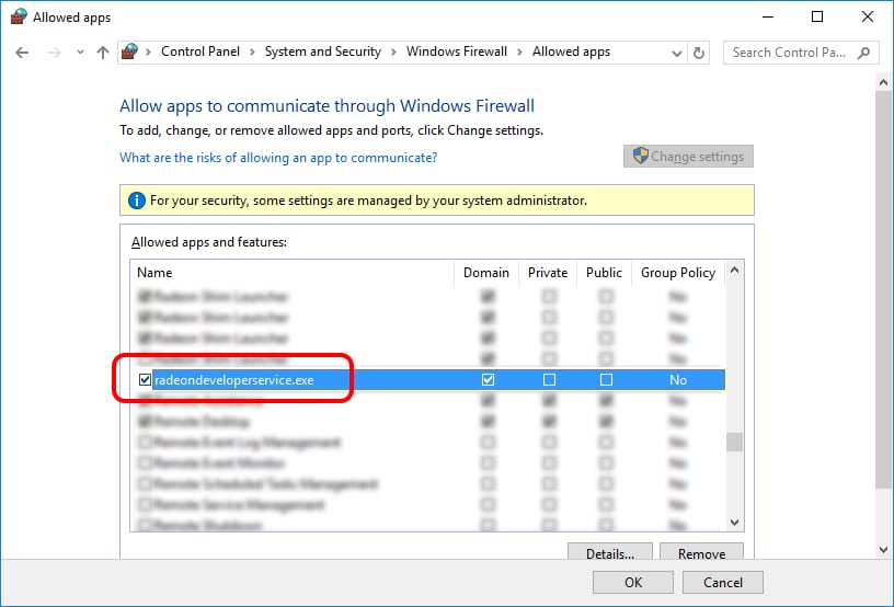 - If “Cancel” was previously clicked in the above step during the first run, the exception for RDS can still be enabled by allowing it within the Windows Control Panel firewall settings. Navigate to the “Allow an app or feature” section, and ensure that the checkbox next to the RadeonDeveloperService(.exe) entry is checked: