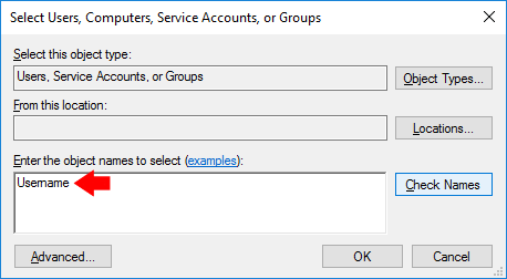 - Type the active user’s account name into the Select Users, Computers, Service Accounts, or Groups dialog, and click OK.