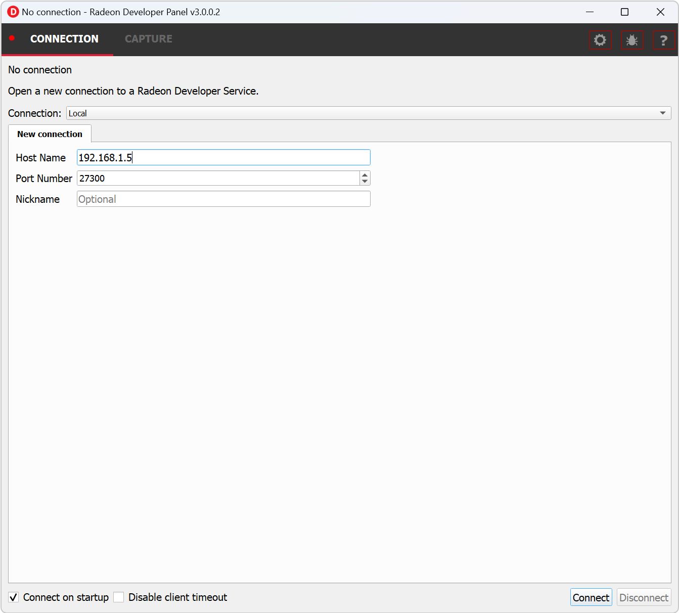 Start the RadeonDeveloperPanel(.exe) on the local system. On the CONNECTION tab, enter the IP address of the remote system in the Host name and then click the “Connect” button.