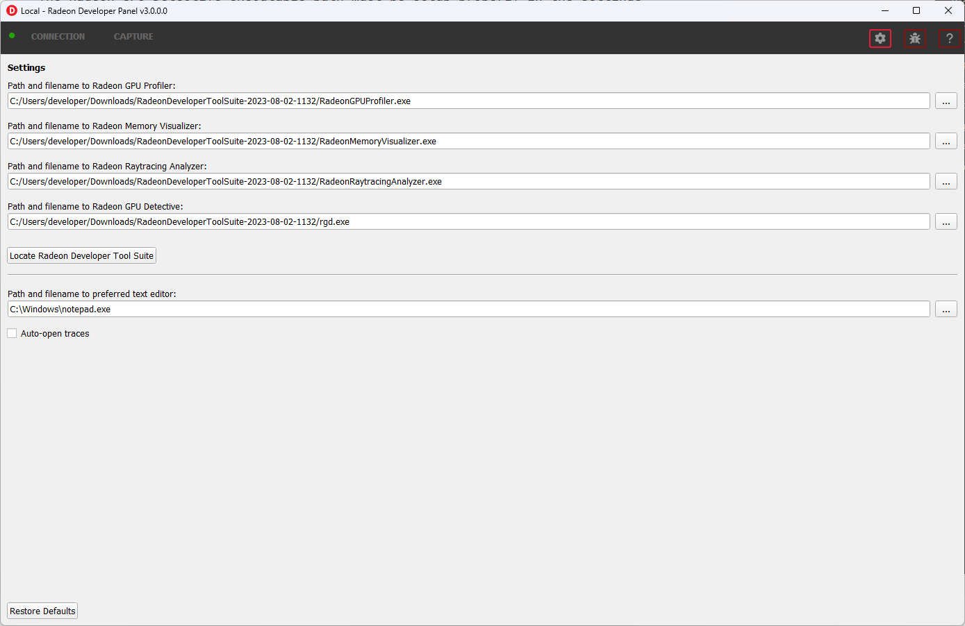 The settings pane allows for choosing the global path to the tool to be used by Radeon Developer Panel to open captured profiles, traces and scenes. For convenience, using the Locate Radeon Developer Tool Suite button will allow for selection of a downloaded Radeon Developer Tool Suite package and automatically configure all paths.