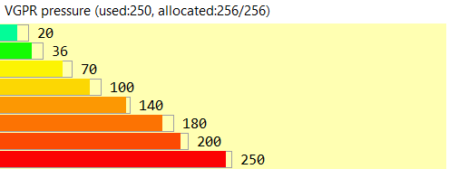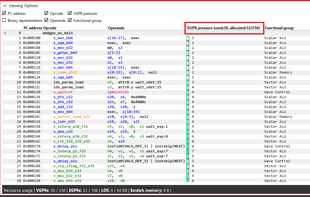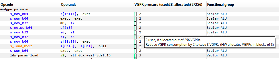 The column header text format is “VGPR pressure (used x; allocated: y/256)”, which provides a summary for the entire shader, where ‘x’ gives the total VGPRs used by the current shader and ‘y’ gives the total number of VGPRs allocated. Hovering over any of the column’s cells, will show a tooltip with a summary of the live VGPR at that specific instruction, with a hint about how many VGPRs need to be reduced to save a VGPR block at that instruction. Note that VGPRs are allocated in blocks, which vary in size. The VGPR block size is determined by the target GPU and, in certain cases, by specific characteristics of the shader, such as the wave size it was compiled for. The hint indicates how many VGPRs need to be freed to free up an entire block of VGPRs at that point of the shader: