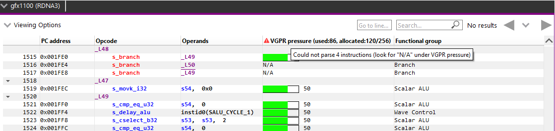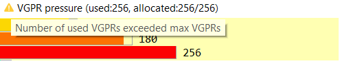In case the number of VGPRs used hits the max on any instruction, there will be a yellow hazard symbol as shown in the image below.