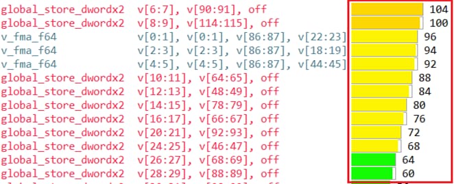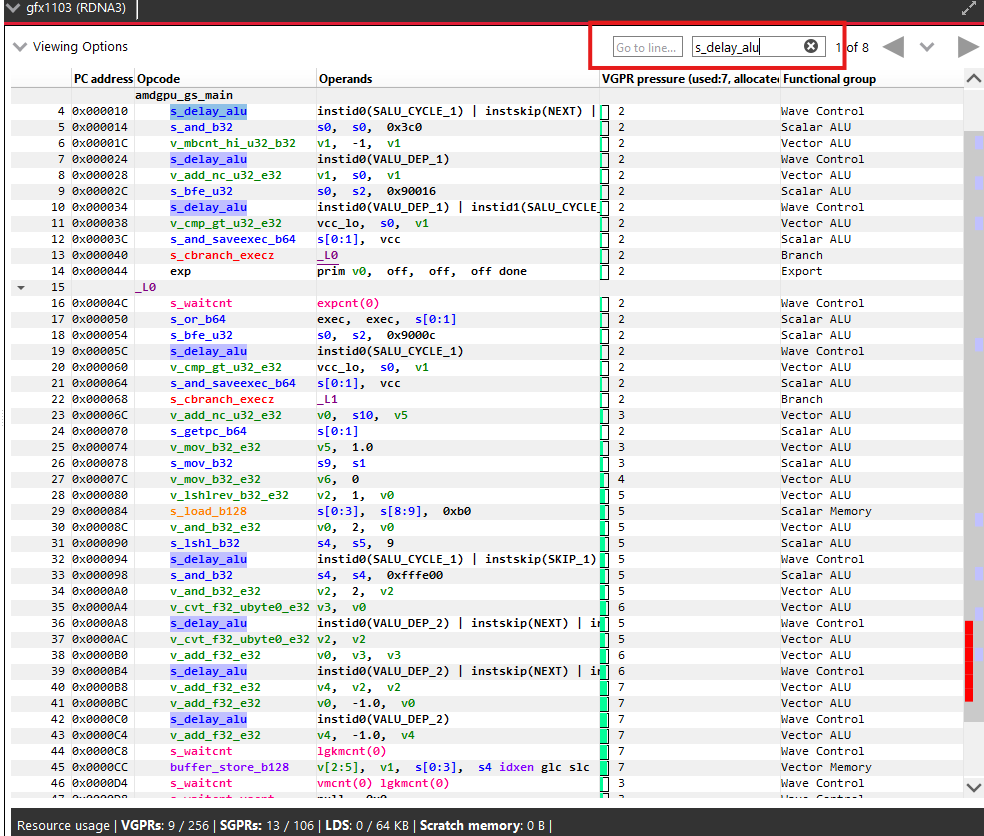 In the above screenshot, we have a shader with a VGPR allocation block size of 8 VGPRs. You can see that different lines have different colors in their visualization bar. The bar’s color would be greener as the live VGPR value at that instruction gets closer to 0 and redder as the value gets closer to 256. The lines where the visualization bar is full (where the VGPR usage value is a multiple of 8, like 104, 96, 88 etc.) show points in the shader where the VGPR allocation block is fully utilized. However, in lines where the bar is partially empty, not all allocated VGPRs are being used. The tooltip hint that we mentioned earlier will let you know how many VGPRs need to be reduced to free up that VGPR allocation block.