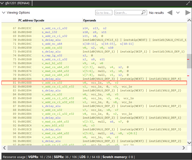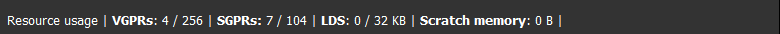 The resource usage section under the disassembly table shows the GPU resources that are consumed by the ISA. The information found in the view is displayed as follows: