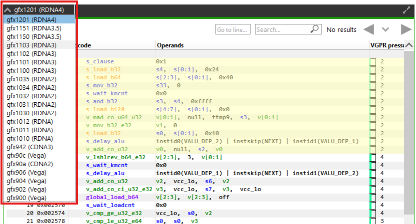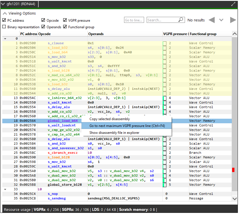 Selecting the “Go to next maximum VGPR pressure line” option in the disassembly view’s context menu also allows you to cycle through maximum live VGPR pressure lines. This option is shown in the image below.