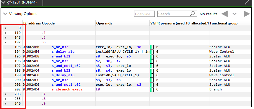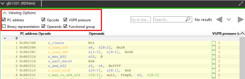 After successfully building your code, you will notice a new column in the disassembly view named “VGPR pressure”. This column is shown by default and can be hidden using the “Viewing Options” dropdown.