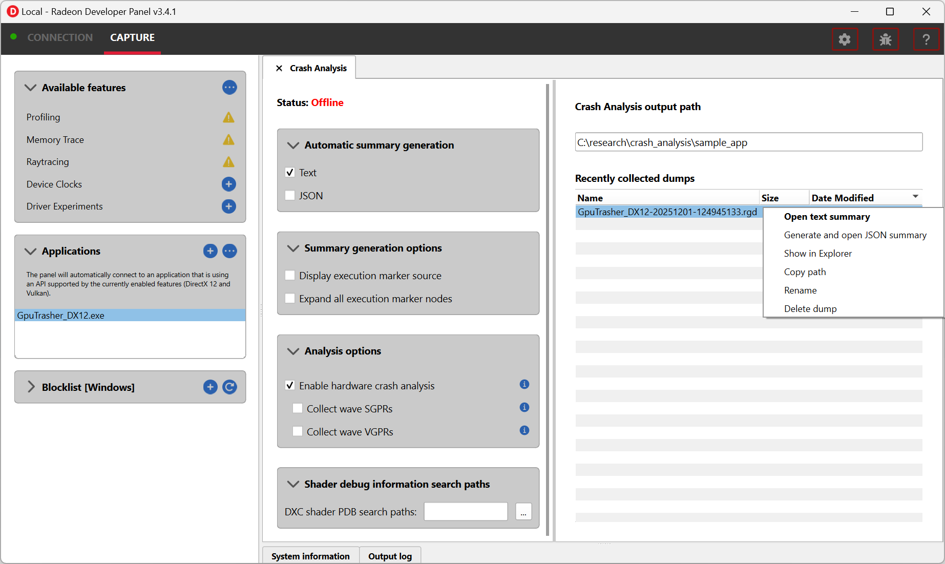 After system recovery, if the crash was detected, you should see a new .rgd file under “Recently collected dumps”. The .rgd file is a binary file that stores information about the crash. RGD doesn’t offer a GUI tool to open these files. Instead, you can convert them to a report in text or JSON format directly from RDP. To do it, right-click and select “Open text summary”: