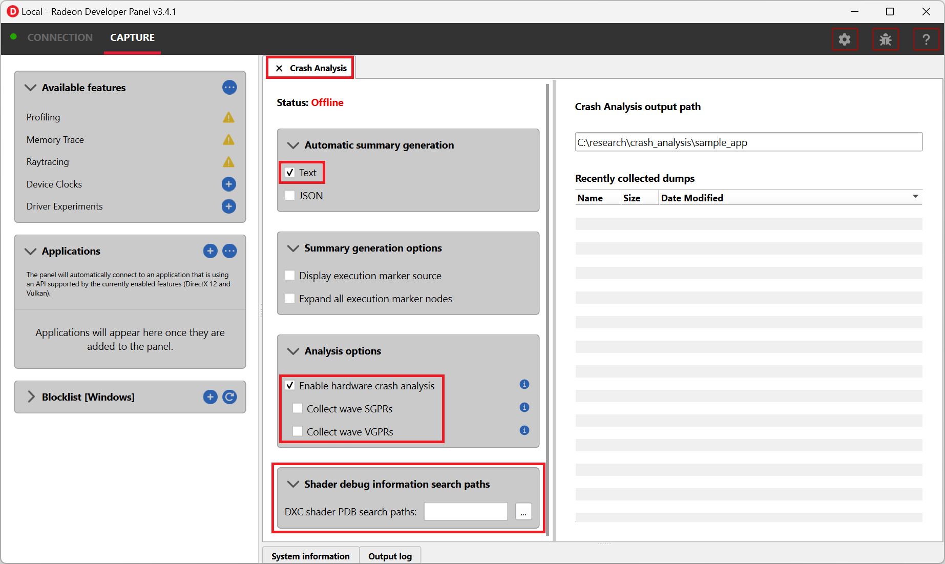 Optionally, provide PDB search paths in the “DXC shader PDB Search Paths” field to enable high-level shader details in the crash analysis report.