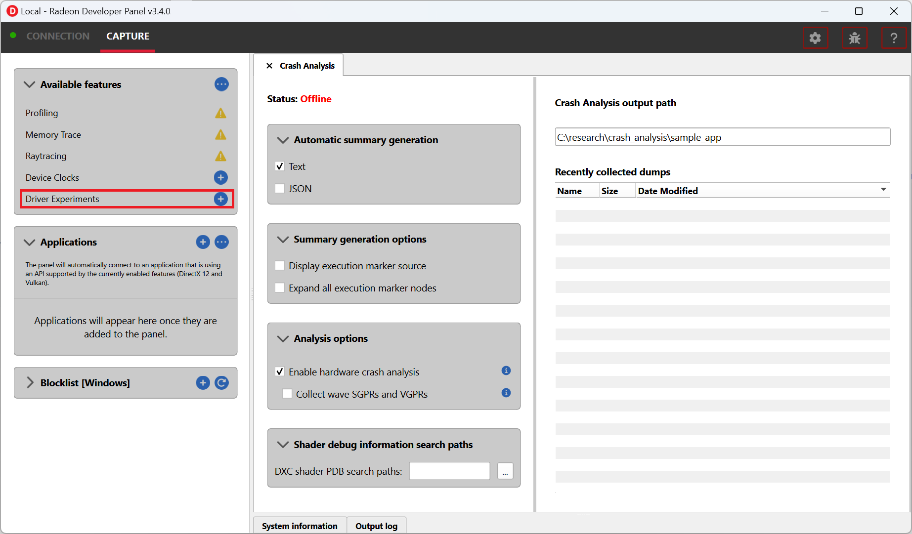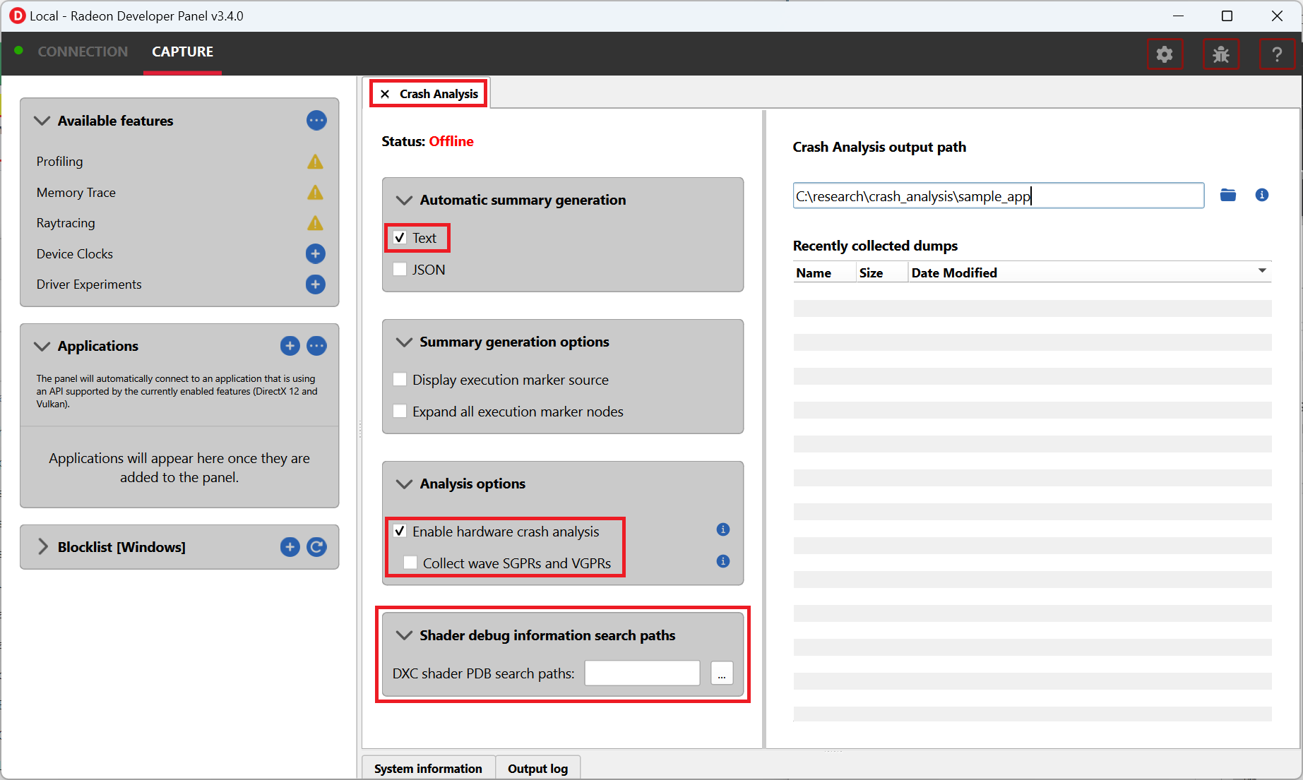 Optionally, provide PDB search paths in the “DXC shader PDB Search Paths” field to enable high-level shader details in the crash analysis report.