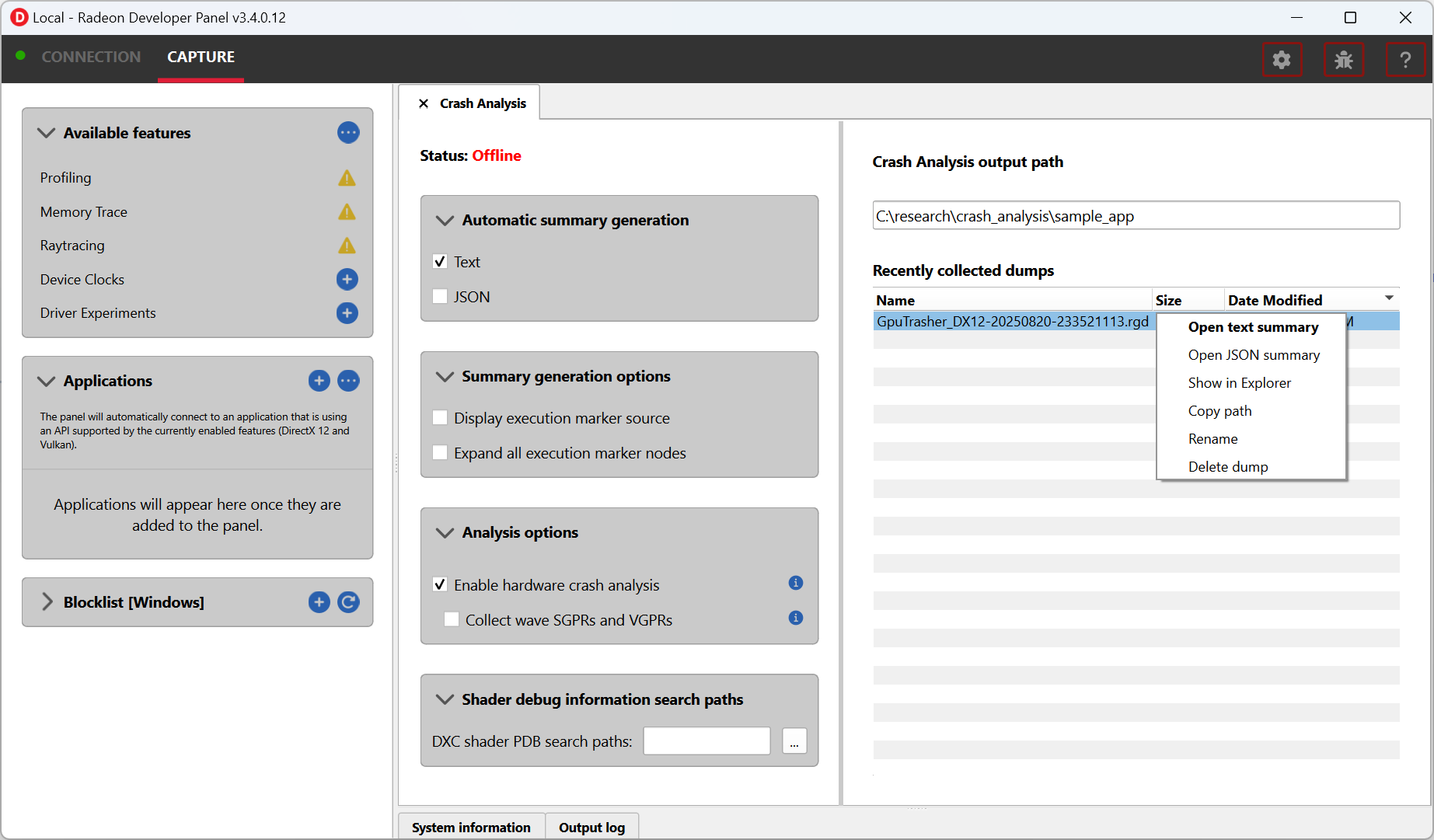 After system recovery, if the crash was detected, you should see a new .rgd file under “Recently collected dumps”. The .rgd file is a binary file that stores information about the crash. RGD doesn’t offer a GUI tool to open these files. Instead, you can convert them to a report in text or JSON format directly from RDP. To do it, right-click and select “Open text summary”: