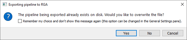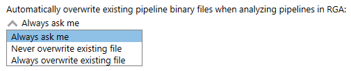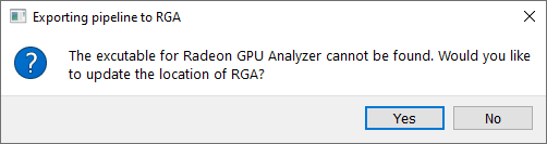 If the pipeline binary being exported already exists on disk a message prompt will appear asking if the file should be overwritten or directly opened in RGA without being overwritten. Select the checkbox in the message prompt to save the selected option for the future and not see this message again.