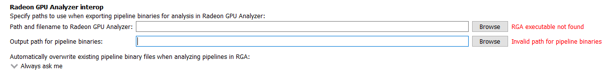 The location of the Radeon GPU Analyzer executable file as well as the location where pipeline binaries are saved can be changed in the Radeon GPU Analyzer interop section of the general settings.