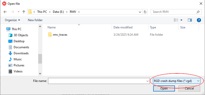 Note that RMV is also capable of loading Radeon GPU Detective (.rgd) files. In order to view .rgd file names in the File open dialog box, be sure to select “RGD crash dump files (*.rgd)” in the file filter dropdown listbox. RGD files load all the same types of data as RMV files, however, they are opened in read-only mode (i.e., created snapshots are not saved).