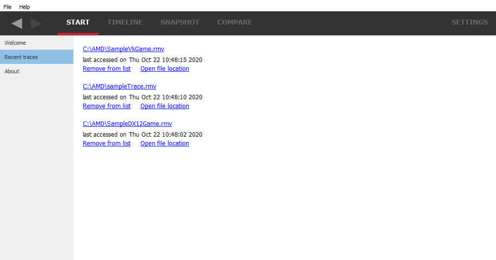 Notice that there is additional information provided for each trace when viewed in this pane, such as the date when the trace was last accessed. It is also possible to remove recent traces from the list using the “Remove from list” link button. Note that they will only be removed from the list; they won’t be deleted from the file system. There is also a link button, “Open file location” to open the folder where that trace file is on the disk.
