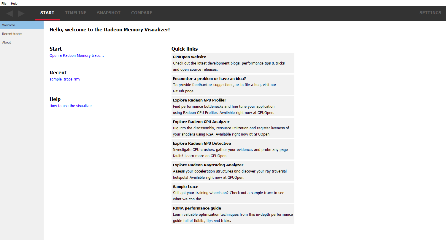 - Go to the “Welcome” view and click on the “Open a Radeon Memory trace…”