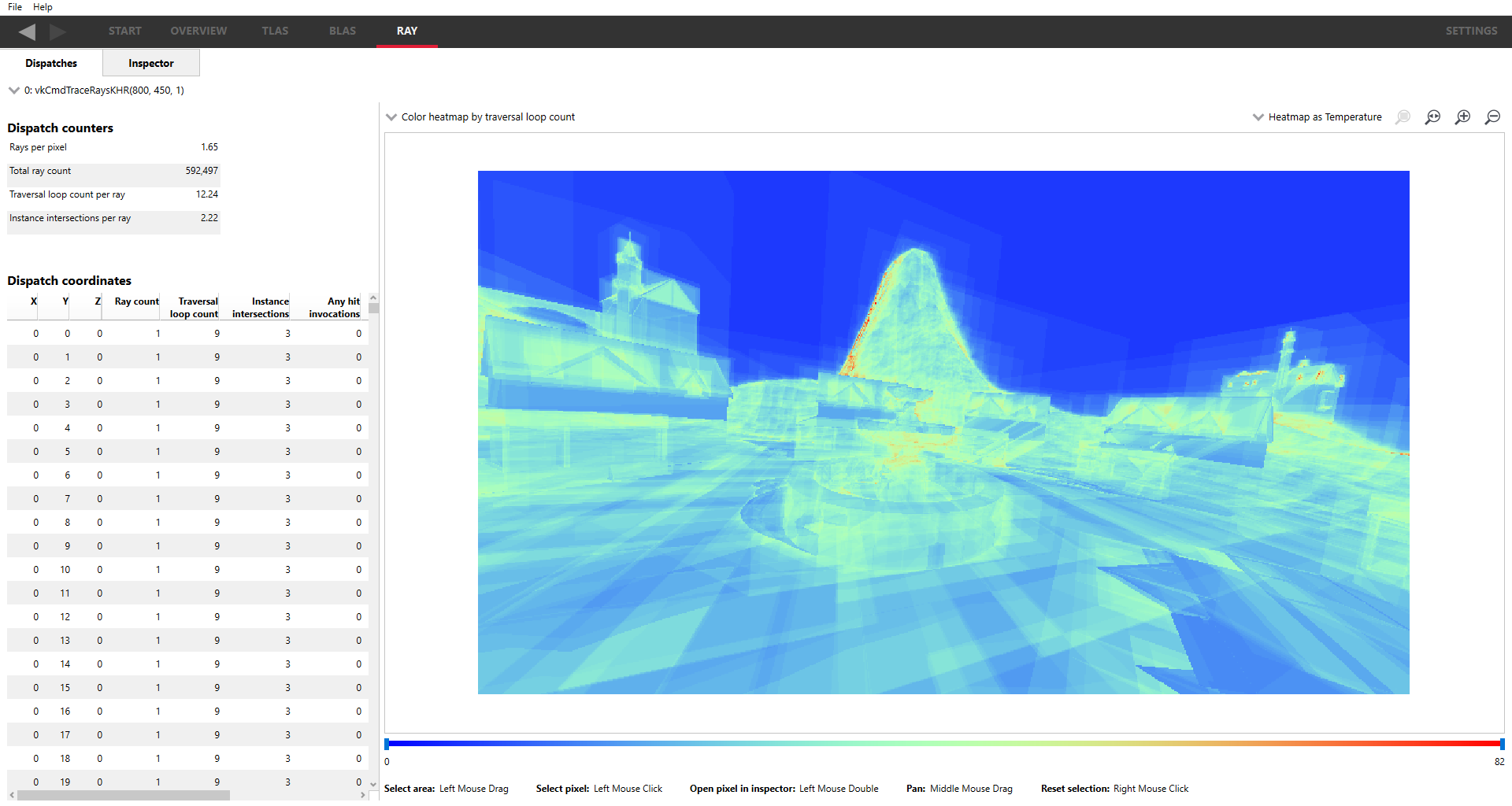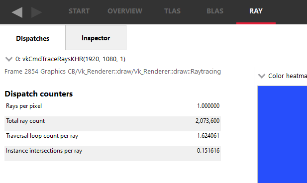 Below the dispatch selection dropdown is the Dispatch counters table which shows some high-level statistics for the selected regions in the heatmap (see below), such as the ray count and number of instance intersections per ray.