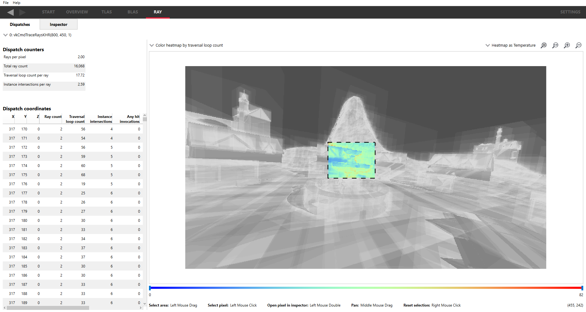 After selecting a region, the dispatch table will be updated to only contain the rays within the dispatch coordinates of the selected region and the dispatch counters statistics will be updated as well. Double-clicking on an entry in the table or a pixel in the heatmap image will navigate to the Ray Inspector pane.