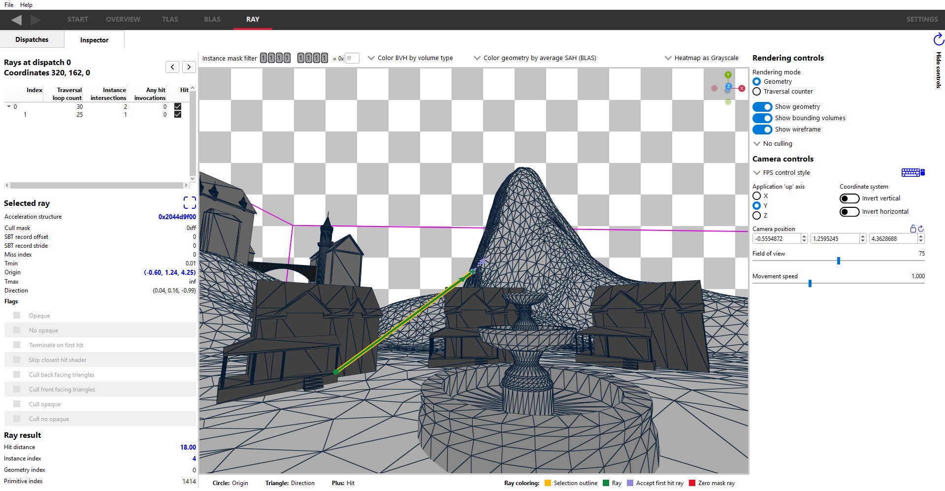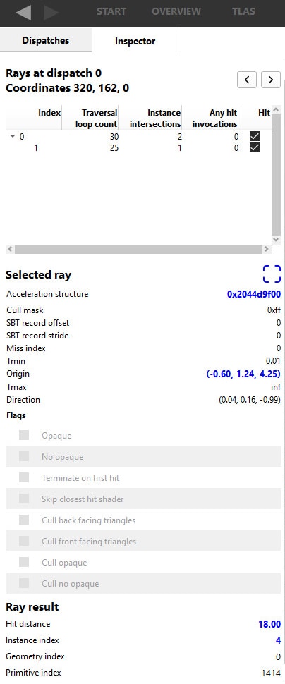 The Ray result section shows the distance of the accept hit as well as the instance index, geometry index, and primitive index of the hit triangle. These fields will be blank if the ray misses.