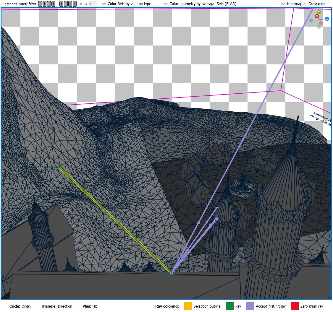The instance mask in the top left shows the instance mask of the currently selected ray, and will update the 3D view to only show instances which are included by the mask. Unlike in the TLAS tab, the instance mask filter is read-only in the Ray tab. The rays with an instance filter mask of 0 will be colored red (by default) to indicate that the ray will have no chance of invoking a hit shader.