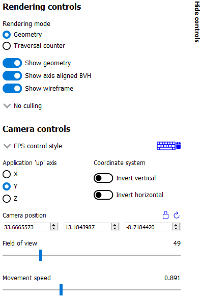 A notable difference is that this pane contains a lock button to the right of the Camera position label. When locked, the camera will preserve its position when changing the selected dispatch coordinate in the Dispatches tab instead of focusing on the first ray in that coordinate’s ray list.