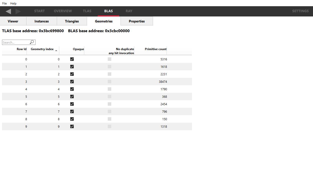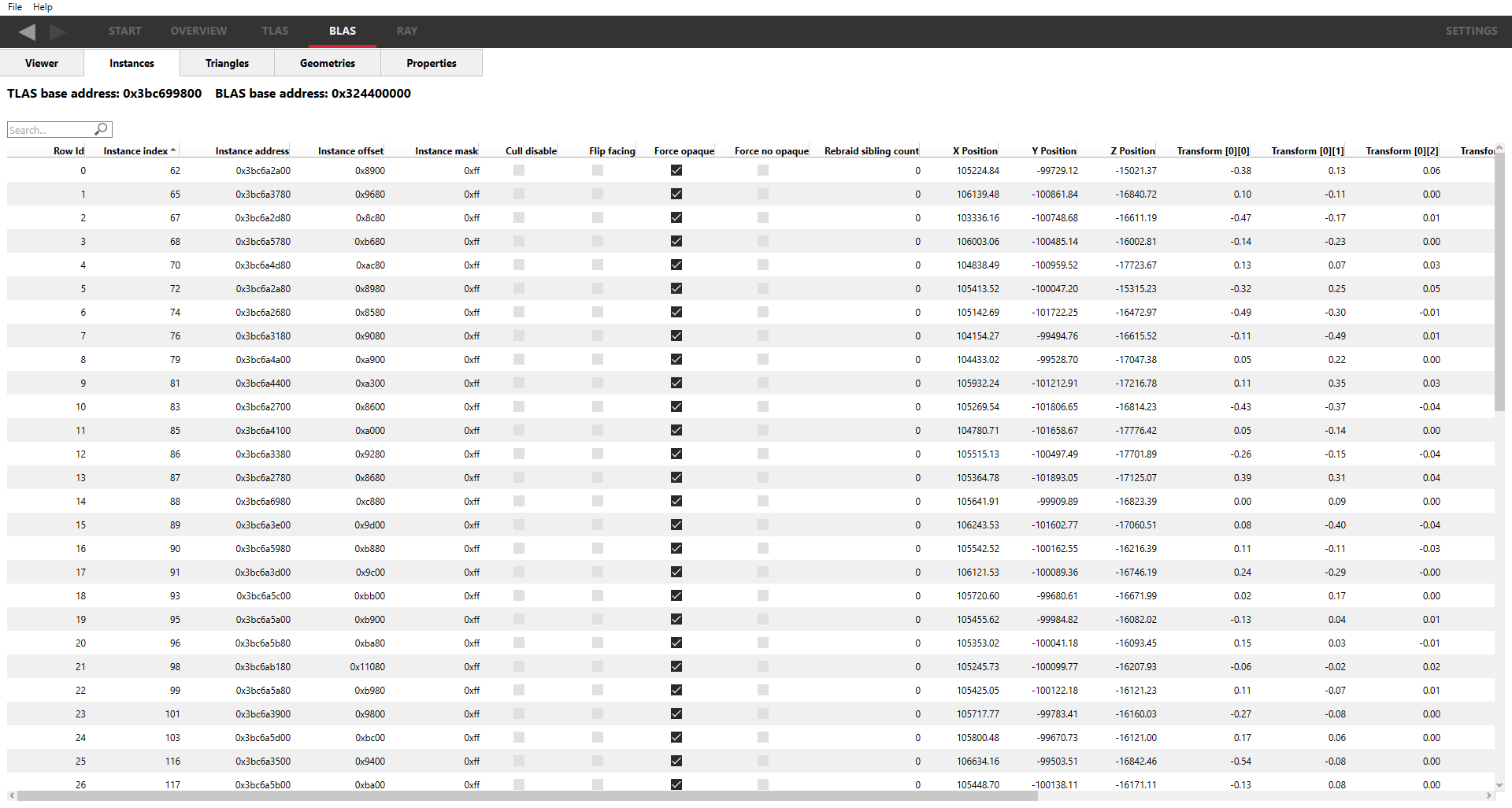 Above the table is the base address of the BLAS used by all the geometries, and the base address of the TLAS containing the BLAS.