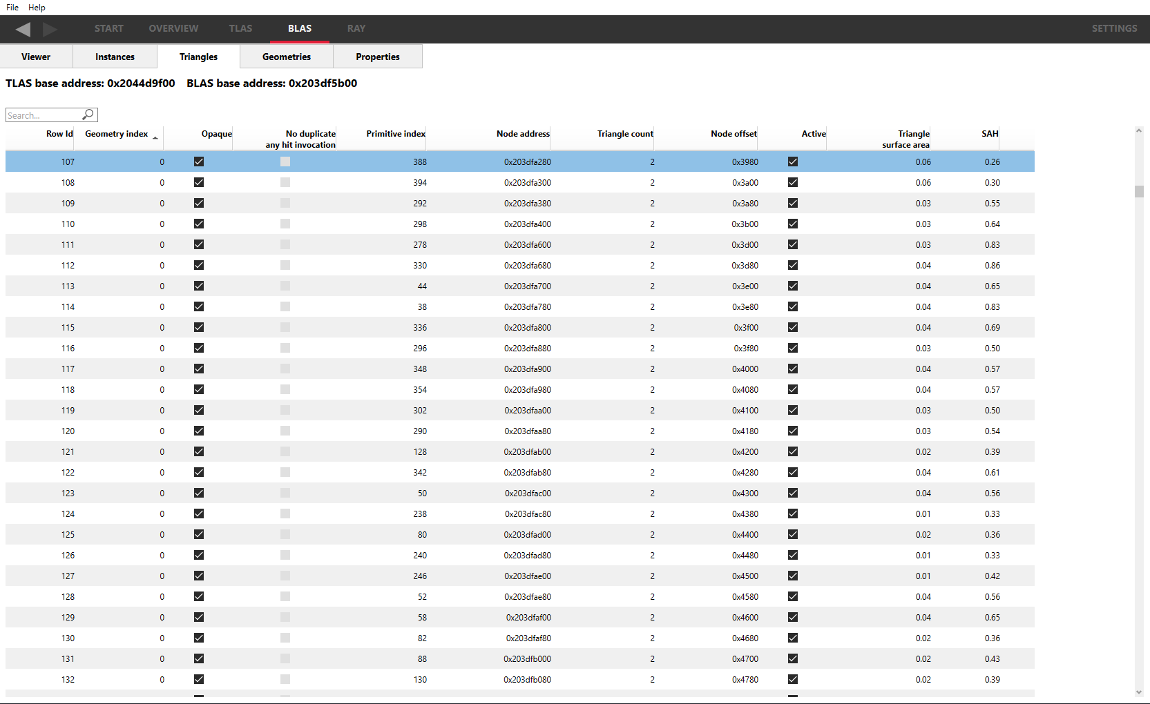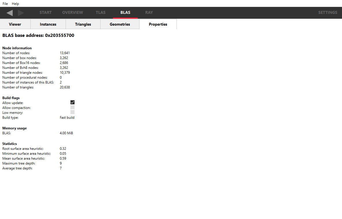 This pane is very similar to the TLAS viewer, except the leaf nodes are triangles instead of instances.