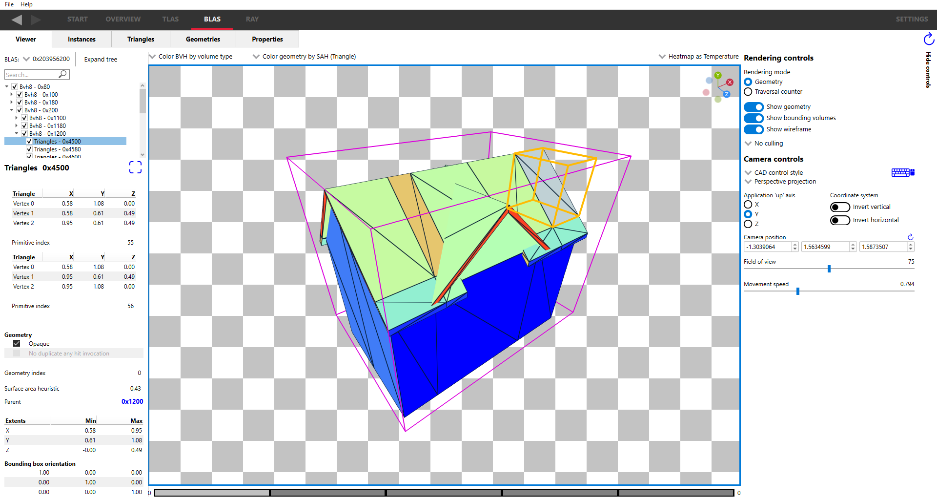 On the right are the same rendering and camera controls as seen in the TLAS pane; the functionality of these are nearly identical. The only difference is that there is no option to show instance transforms in the BLAS pane.