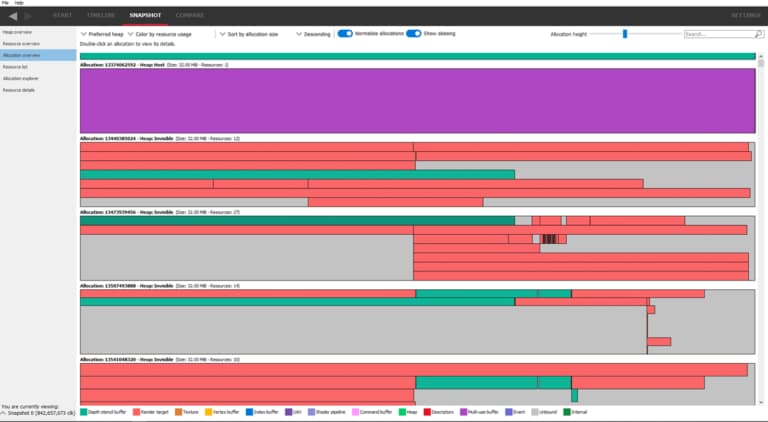 Radeon™ Memory Visualizer (RMV) v1.1 now has support for showing aliased resources in the allocation overview and allocation explorer panes, and reworking of the resource “Filter by size” slider throughout so that the resources are more evenly distributed. Empty tables show a graphical indication and description as to why the table is empty, and there’s also a “Color by commit type” coloring mode. You’ll also find a search box and filter by allocation size to the allocation table in the allocation explorer pane, and a “Show unmapped resource memory in residency” donut in the resource details pane.