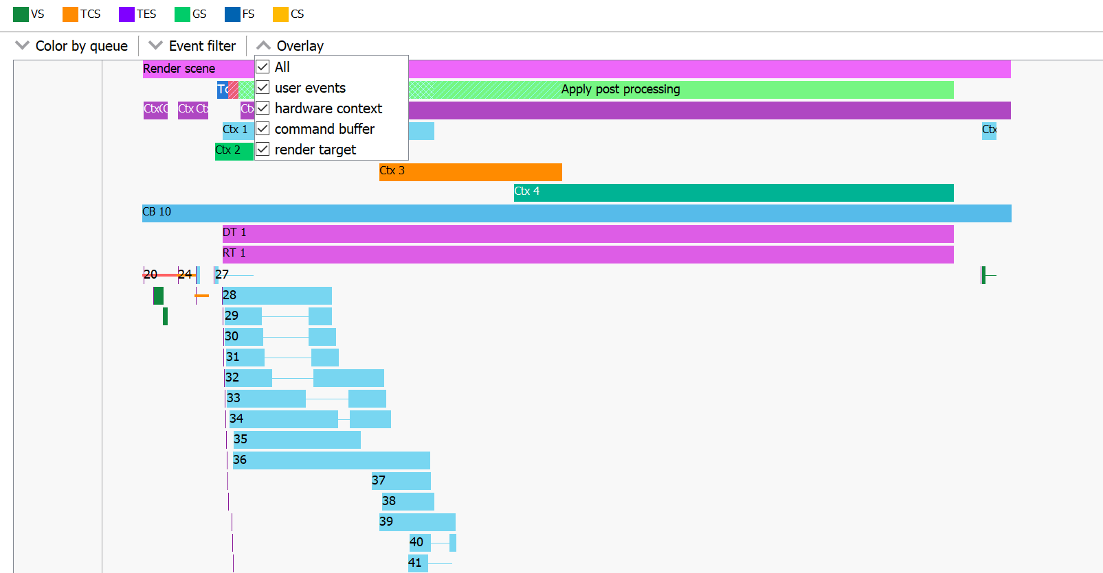 Next, the timeline in the Wavefront Occupancy view now includes several overlays which allow you to visualize additional data alongside the events. In previous RGP releases, user events were displayed at the top of the timeline to provide extra context to the actual GPU events. In RGP 1.7, this has been enhanced to allow optional display of additional overlays. The new overlays supported are Hardware Contexts, Command Buffers, and Render Targets.