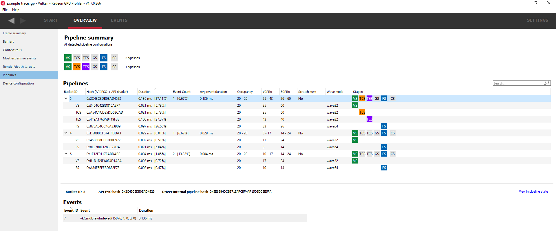 First, a new Overview pane has been added: the Pipelines pane. This pane summarizes the pipeline usage for the profile, including detailed information about the shaders contained in the pipeline and the events which use the pipeline. In the image below, you can see this new pane.