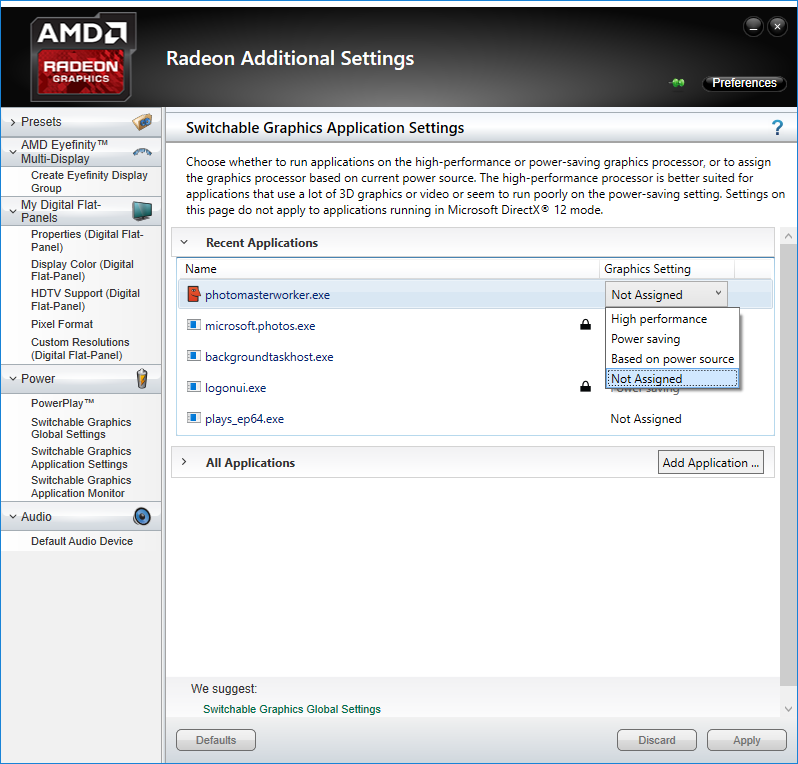 Conveniently, the graphics driver includes a list of common games and applications — most of which can be changed by the user. Moreover, the user can add applications.
